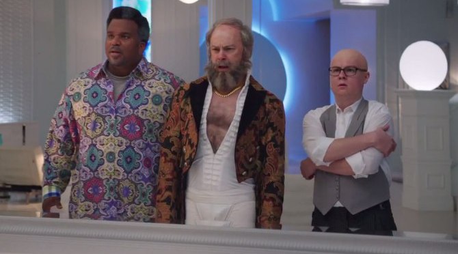 Hot Tub Time Machine 2 picks up where the first film left off with most of the primary cast from the first film in highly successful stations in life. Nick (Robinson) is a singer-songwriter who has taken well-known ballads and made them his own. He even has a lame dance in the same vein as the “Macarena”. Lou (Corddry) used the basic principles of Google and turned it into his own mega company: “Lougle” and Jacob (Duke) is Lou’s butler much to his chagrin. Everything seems to be going well for everyone. Even Adam (Cusack), who is absent from the proceedings but that’s explained in the film. When Lou is shot in his privates by an unknown assailant at a party, the three men fire up the time machine once again so they can find out who the shooter is and restore peace to the timeline.